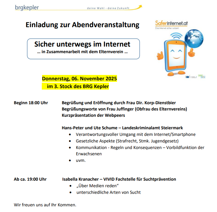 Wir laden alle Eltern, deren Kinder im nächsten Schuljahr in die erste Klasse des BRG Kepler kommen werden, am 25.06.2025 mit Beginn um 18:30 Uhr sehr herzlich zu einem Elternabend ein. Die Veranstaltung findet im 3. Stock in der Pausenhalle statt.