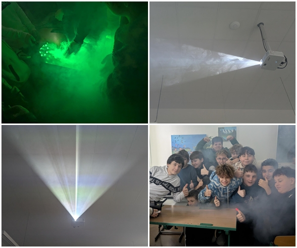 Im Physikunterricht brachte ein Schüler eine Nebelmaschine mit. Der feine Nebel in der Luft machte die Lichtstrahlen sichtbar, die normalerweise für das Auge unsichtbar sind. Mithilfe eines Laserpointers konnte so deutlich gezeigt werden, wie sich Licht geradlinig ausbreitet und wie Lichtstrahlen durch den Raum verlaufen. Durch den Nebel wurden die Wege der Strahlen klar erkennbar, wodurch die theoretischen Inhalte aus dem Unterricht leichter verständlich wurden und die Kinder staunend und faszinierend zurück blieben.