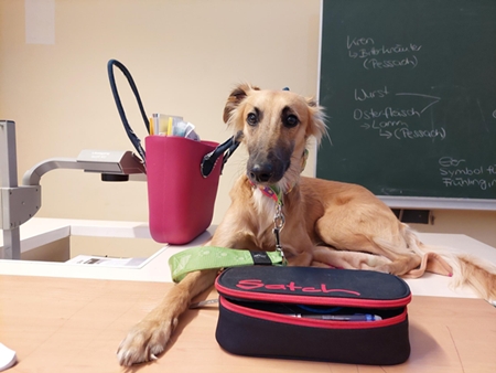 Im Biologieunterricht beschäftigt sich die 1A Klasse gerade mit dem Thema des Haushundes und zu diesem Anlass durften wir ganz besonderen Besuch empfangen – Cesare, ein Silken-Windsprite Rüde und der Hund unserer Religionslehrerin und akademisch geprüften Fachkraft für tiergestützte Aktivitäten und Fördermaßnahmen Mag. Daniela Brunner. Seit Oktober 2025 absolviert Cesare außerdem an der Pädagogischen Hochschule Eisenstadt die Ausbildung zum Schulhund, die er mit derselben Prüfung wie Therapiehunde abschließen wird.