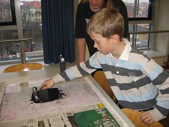 Im Textil Workshop (betreut von Stefanie Menzinger) wurden sie von Schülerinnen der 4a mit der Technik des Siebdruckes vertraut gemacht, die auch die dafür notwendige Vorarbeit im Textilunterricht bei Marie Neugebauer geleistet hatten.